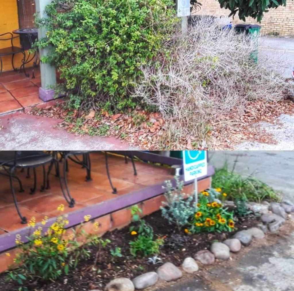 For Pacha Cafe in Austin, Texas, my goal was to clean up and update a very neglected front/parking area that was unattractive and hard to navigate around. I first deleted an enormous dead Lantana, then heavily pruned remaining plants. After amending the old unhealthy soil, I added a number of sun loving, drought tolerant plants and Native perennials (to survive brutal Texas summers!) like Echinacea, Russian and Jerusalem Sage, Mexican Flamevine, and Coreopsis. A new rock border and granite sand added to fill in holes and cracks added some needed curb appeal and safety. A Pacha regular named Barry was so pleased he custom designed a new patio railing fashioned after garden tools in honor of what I accomplished.. I was very touched!
