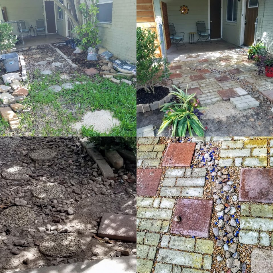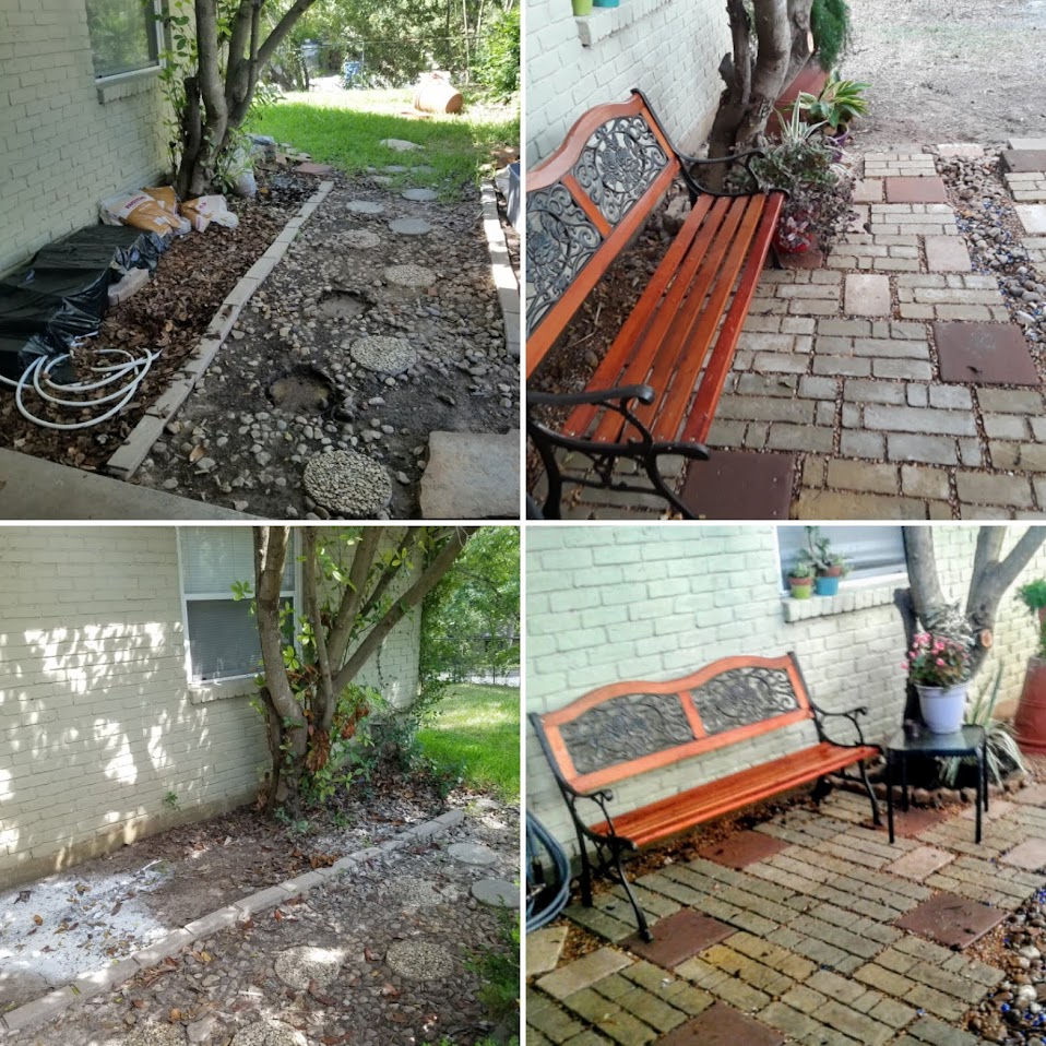 I was asked to redo both sides of an Air BNB front area that had been long neglected in Austin Texas. Both sides were unsafe, barely walkable and very unattractive. For the left side, I removed all the old flagstone; leveled/smoothed the area; added paving sand and 60 patio pavers, then filled in with pea gravel. As a border and added drainage, I added black polished Japanese stones. After a new fence and gate were built (not by me)a bistro set and outdoors string lanterns were added for seating and ambience. Also new lighting was added in the driveway for safety and to add some softness.