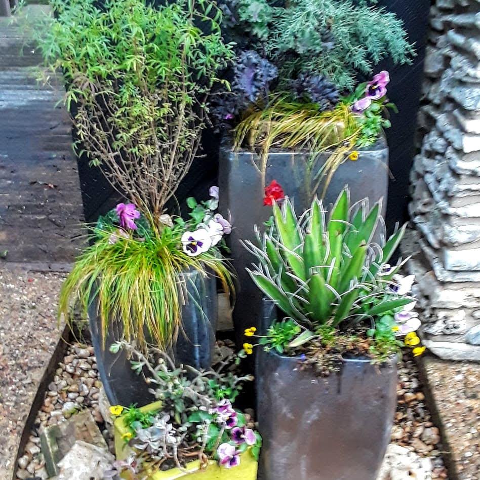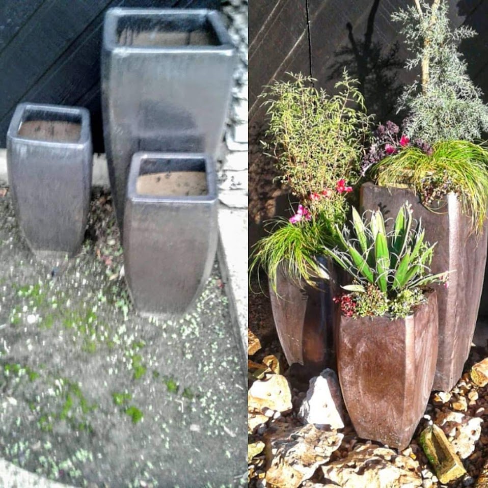A client in Austin needed a ‘naked’ area next to her front gate filled in with greenery to soften and pretty up her front entry. I decided a tiered effect would work well, so after choosing 3 sizes of gun metal gray planters, I filled each in with high drainage materials (plastic recyclables) then added soil. The client requested low maintenance plants that could better survive Texas weather with minimal care, so I utilized a Juniper, Mexican Mint Marigold, a Blue Agave and a few decorative grasses. Seasonal annuals were added for color and would be changed out occasionally from winter/summer etc.
