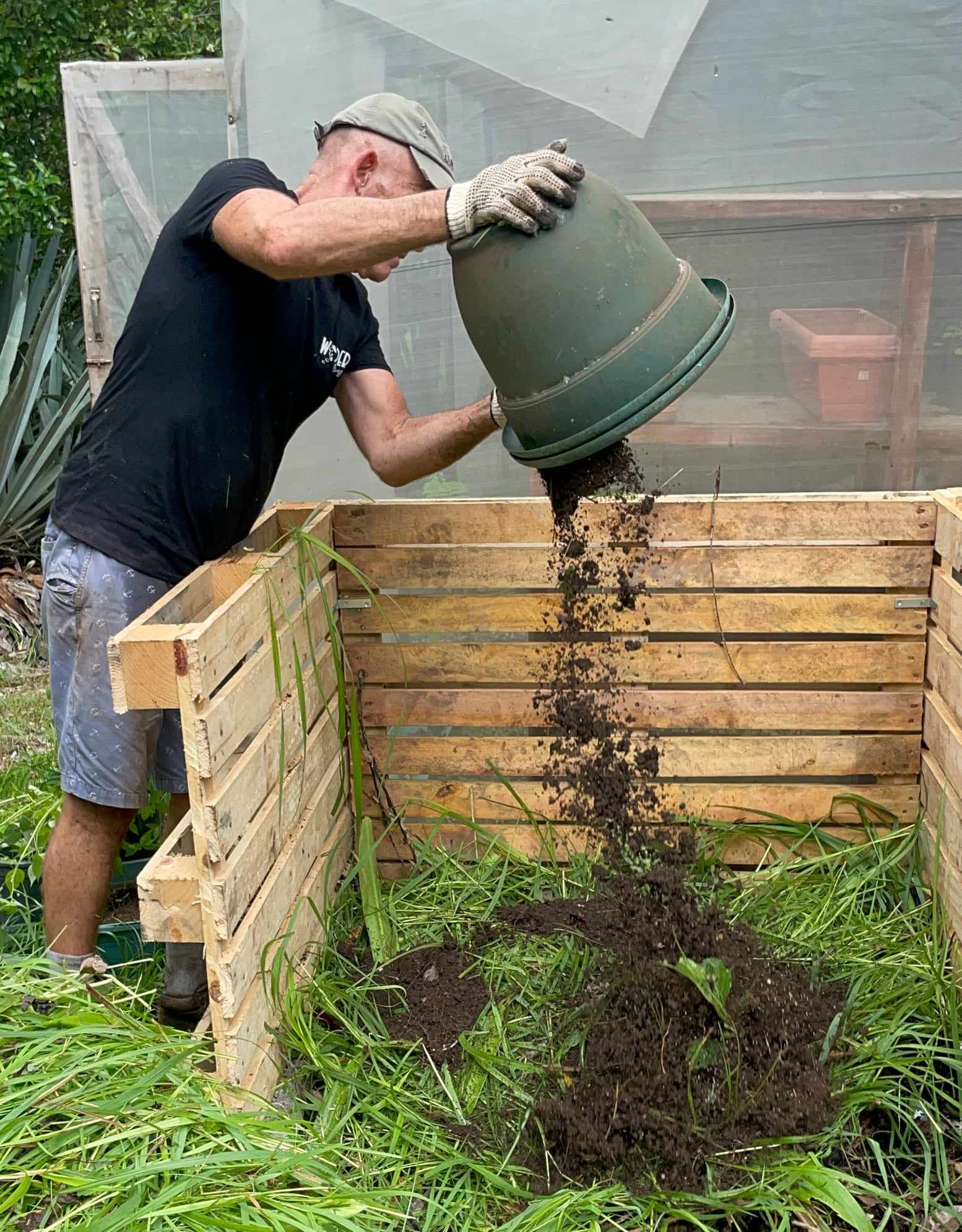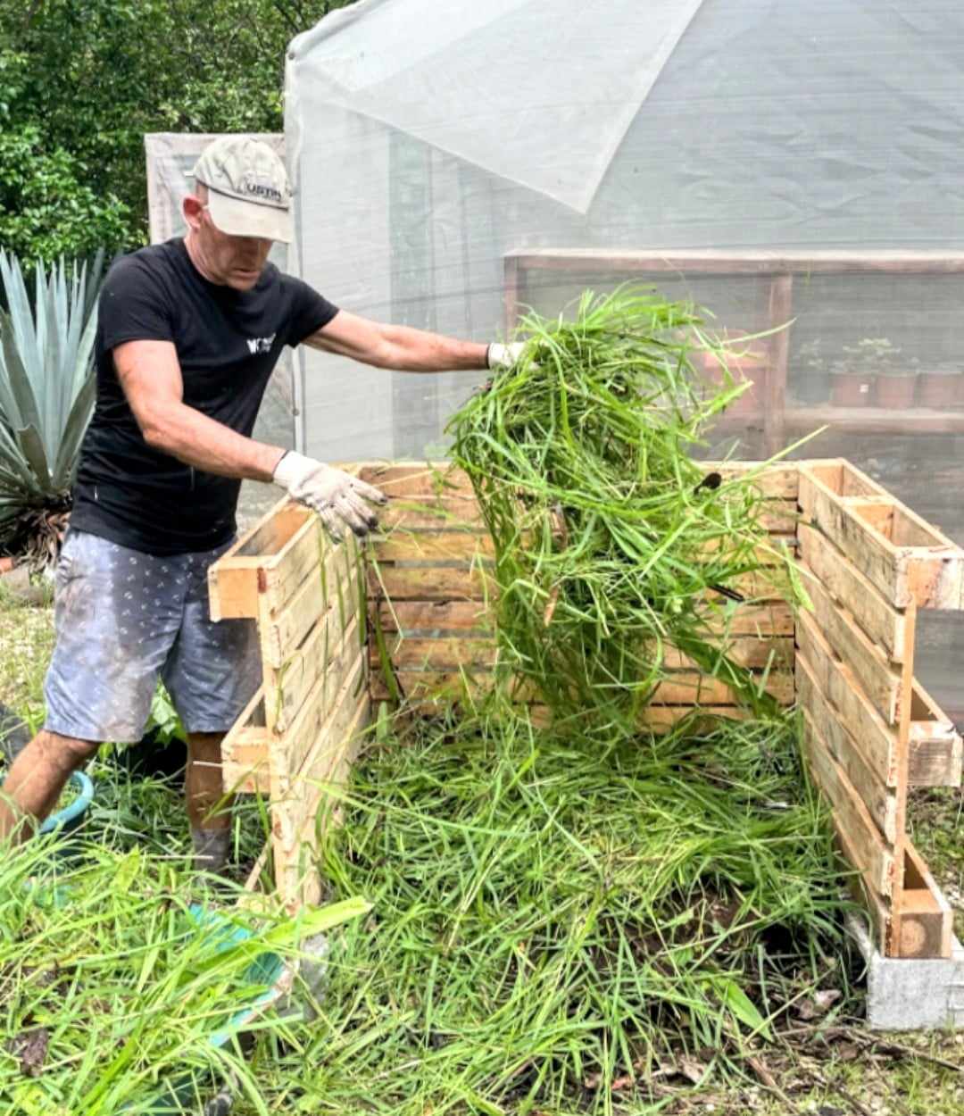 While in Tamarindo Costa Rica we needed a compost bin for a nature/animal park called Monkey Park. With great help from volunteers, we used old pallets, trimmed them to fit and created a 3-sided compost bin, which was then filled almost full with alternating layers of brown, green, brown, etc. Ultimate goal was 3 bins in succession so as material degraded it could be moved over and new added.